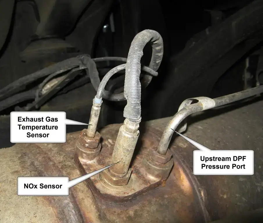 Duramax 6.6L engines mount both sensors on the driver’s side. The upstream sensor locates between the turbocharger outlet and DPF, approximately 12 inches from the turbo flange. Downstream sensor access sometimes requires raising the transmission crossmember slightly for wrench clearance.